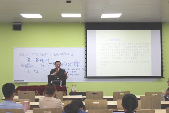 活动开始,主持人简单介绍之后,邹卫老师便走上了讲台。首先,他给大家推荐了几本与主题相关的著作,之后介绍了民间信仰的定义,接着便开始讲解主要内容——信仰的对象了。