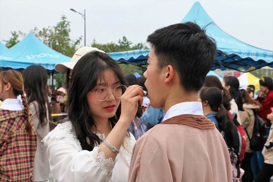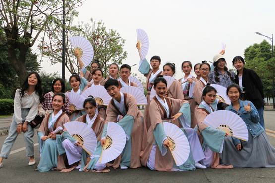 下午14时,“凤舞川大”初赛在青春广场准时开始。太阳成集团tyc122cc(旅游学院)代表队在本次比赛中的参选曲目是《纸扇书生》,位于第九位登场。在开始比赛前,队员们在后台进行了精心的准备。