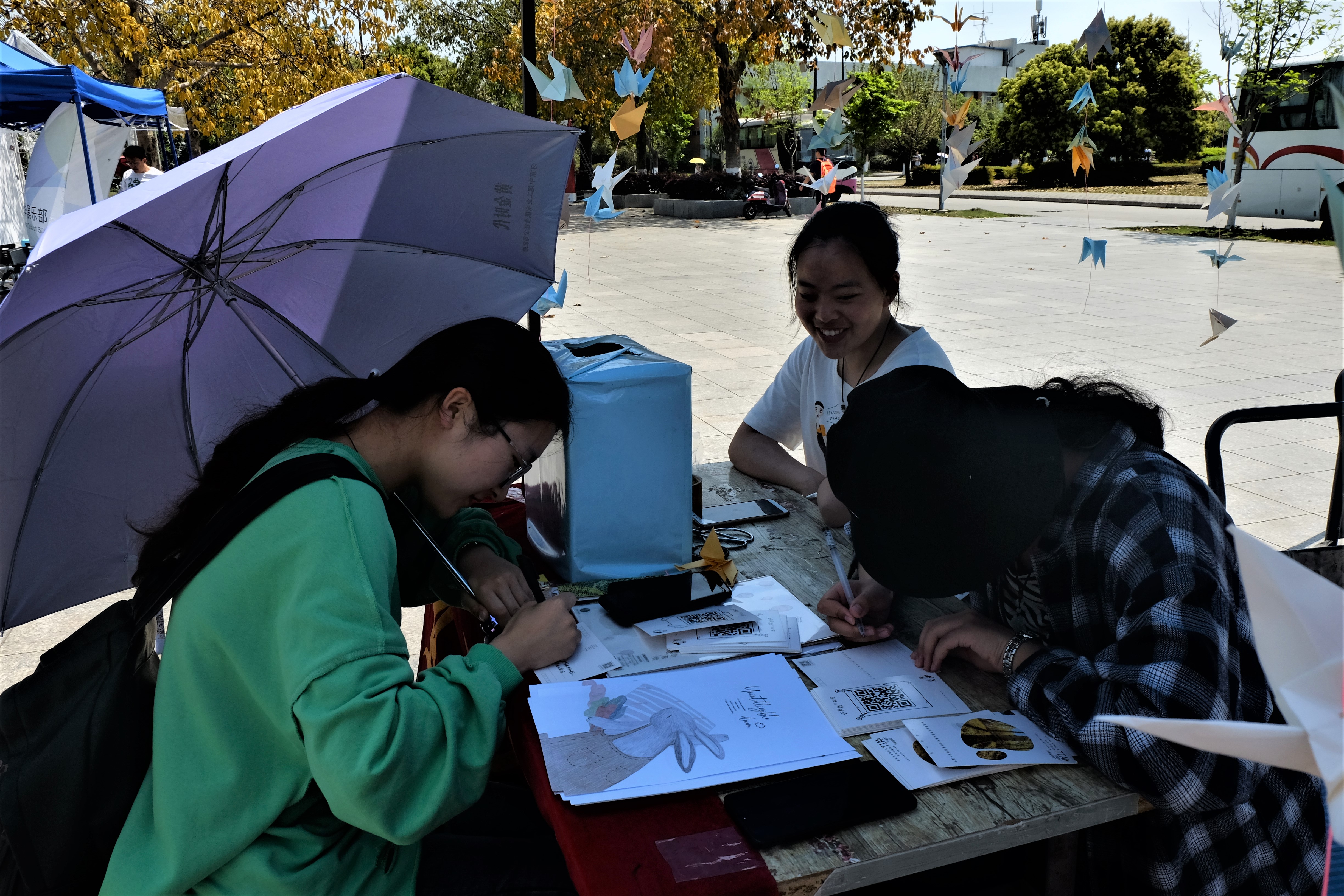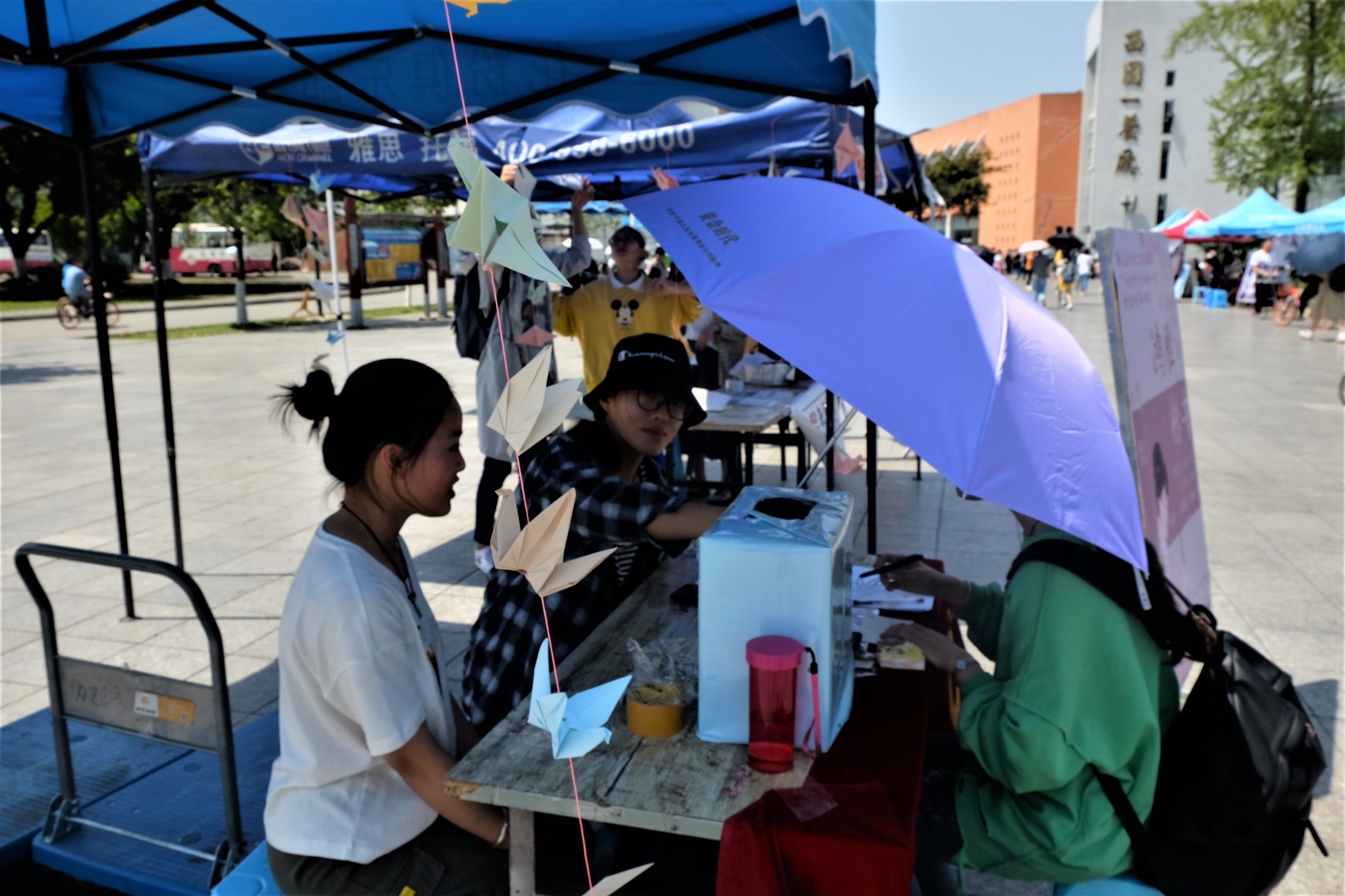 早晨八点,学术科技部的干事们就已经搭好帐篷、挂好千纸鹤和折纸、布置好桌面耐心地等待同学们的到来。