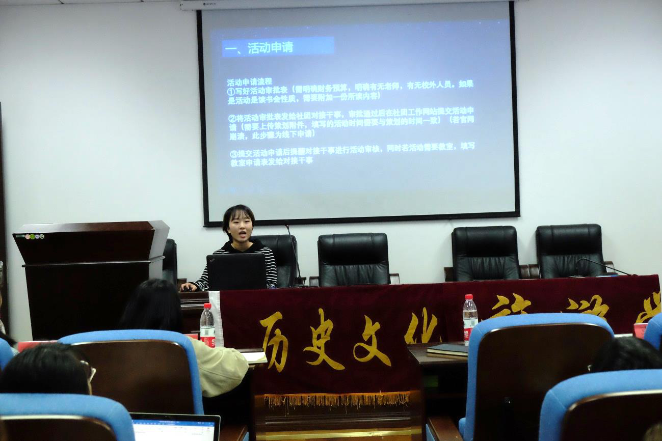 最后由社团联合部部长张腾双同学强调了一下今后社团工作的具体内容。一是活动申请,需要提前一周上交活动审批表;二是材料收集,她提到了新闻上传的注意点和财务公示表;最后是相关的评比事宜。
