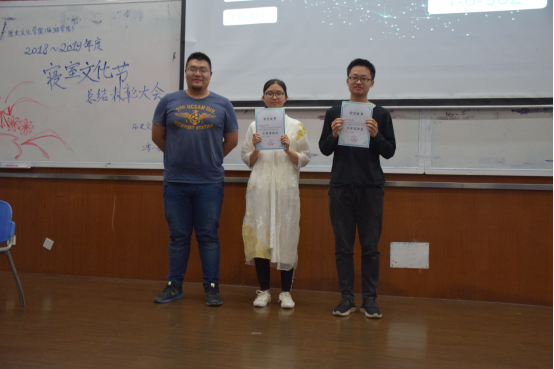在紧张刺激的抽奖环节之后是星级寝室颁奖环节,武清旸老师为本次寝室文化节系列活动中荣获五星级寝室荣誉称号的寝室颁发了证书,并与获奖寝室代表合影留念。