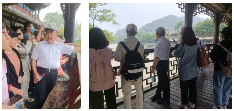 此次参观的第一站是中国最为伟大的水利工程之一:都江堰。踏入景区的那一刻,陈力老师便化身成一名专业导游。他对每一处景点都了如指掌,走到哪里都能滔滔不绝地为同学讲解,其思路条理清晰,又不乏平易近人的语言,甚至吸引了众多路人的目光,他们追随着老师的脚步,自愿成为他的听众。陈力老师带领同学们参观了南桥、伏龙观、安澜索桥、离堆等景点,并与同学们系统地梳理、考察了水利工程的各个主体。除了讨论都江堰本身,他还讲话题上升至哲学、社会学、文字学等领域。经过了一上午的参观学习,同学们意犹未尽,纷纷表示受益匪浅。