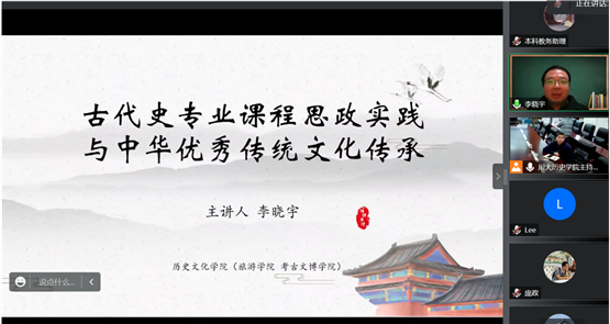 李晓宇副教授分享主题为古代史专业课程思政实践与中华优秀传统文化,内容包括中国古代史专业的历史传统与团队状况,古代史专业课程,授课情况等。