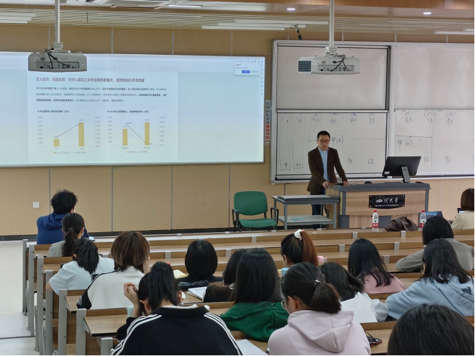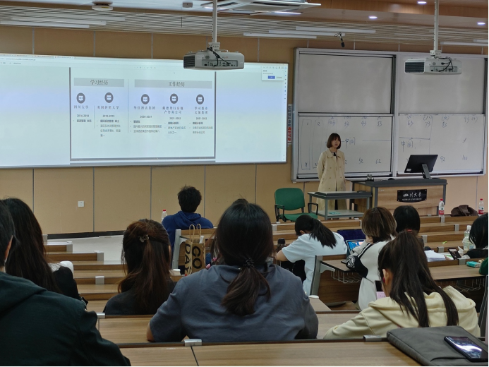 第二位进行宣讲的嘉宾是田霞学姐,2018年毕业于川大旅游管理专业,后前往英国萨里大学学习,先后在华住酒店集团、德梁行房地产咨询公司、华可都市文旅集团工作。田霞学姐首先分享了自己关于留学的看法,为同学们提供参考。其后,详细介绍了酒店行业的职业路径,通过具体案例的结合,从酒店投资路径角度分析了酒店行业大体工作内容。在最后,田霞学姐提出了酒店中有哪些职业以及我们是否会被AI取代的问题,引发同学们的思考。