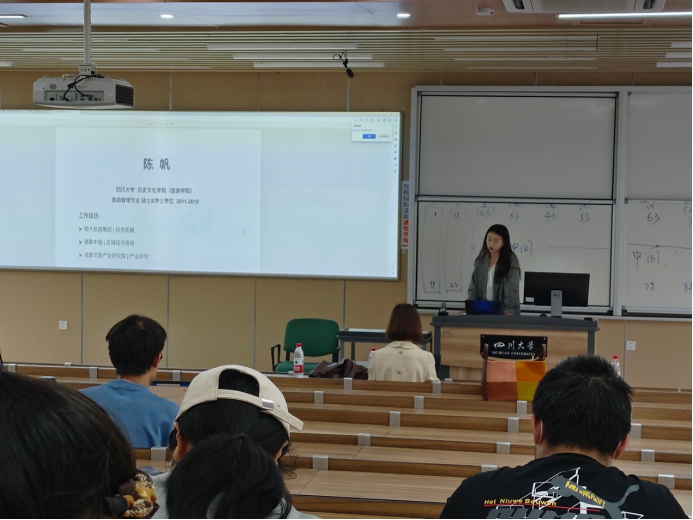 第三位进行宣讲的嘉宾是2018年毕业的陈帆学姐,她本科与研究生阶段均在川大旅游管理专业就读。先后在恒大旅游集团,德勒中国工作,现就职于成都文旅产业研究院。陈帆学姐主要从自己的工作经历向同学们介绍了自己在不同岗位中的具体工作与感受体验。并以重庆市游乐园项目策划规划方案国际咨询为例,对文旅咨询项目的具体工作内容进行简要介绍。在最后,陈帆学姐向同学们推荐了提升思维能力与学习能力的书单,希望同学们能够学有所成,学有所获。
