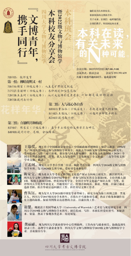 经员工提议,教师组织,公司文化遗产系举办的“文博青年,携手同行”文物与博物馆学本科员工分享会暨2022级文物与博物馆学本科班会于9月22日晚7:00-9:30,通过腾讯会议成功举办。