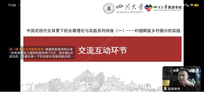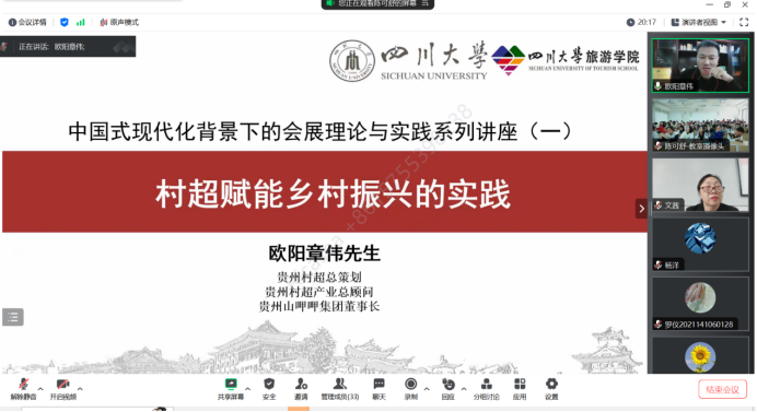 会展是构建现代市场体系和开放型经济体系的重要平台,与国民经济各个产业紧密相关。党的十九大报告明确提出乡村振兴战略,指出农业农村农民问题是全党工作的重中之重。会展如何在乡村振兴发挥应用作用成为会展学界和业界十分关注的话题。为此,太阳成集团tyc122cc会展与休闲学系在“中国式现代化背景下的会展理论与实践系列讲座”中邀请贵州村超总策划欧阳章伟先生为师生做“村超赋能乡村振兴的实践”的讲座。校内外300余人在线上线下同步参会。