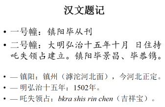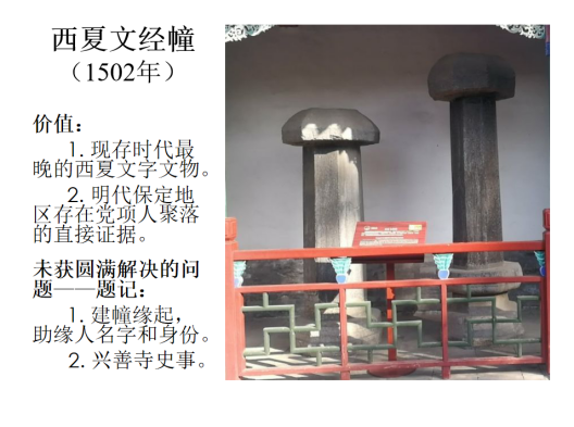 结合这张PPT,先生首先指出这两座西夏文经幢的两点重要价值,一则它们是现存时代最晚的西夏文字文物,二则它们是明代保定地区存在党项人聚落的直接证据。西夏早在1227年就被蒙古所灭,何以在接近300年之后还有西夏文经幢?建立西夏政权的党项人主要居住在今宁夏及其周边地区,政权不曾达于今河北保定地区,何以这个地区在明代还有党项人聚落?这就从时间和空间两方面,激发了在场师生的好奇心。