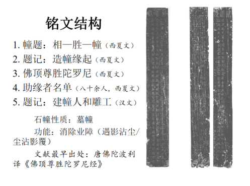 右边的图文不够清晰,聂先生也说明了原因,这是很早以前拓印的,现在政府不准再拓了,所以只能这样将就。在左边,先生则非常清晰地呈现出经幢的铭文结构,包括幢题、西夏文题记、西夏文佛顶尊胜陀罗尼经文(经幢主体内容)、西夏文的助缘者名单、汉文题记。先生还就这两座墓幢何以要刻印佛顶尊胜陀罗尼经文进行解释,言其主要功能就是消除业障,在佛教文献中往往称之为遇影沾尘或尘沾影覆。说到这里,先生耐心地科普道,这是佛教的一个说法,讲的是佛顶尊胜陀罗尼经的非凡魔力,如是说如果有人能书写此陀罗尼经,将它刻在石碑上,或放在塔中,路过的普通人见到这些经文,或与之靠近,甚至只要它们的光影照在身上,或者风吹陀罗尼幢上的灰尘落在身上,则所有的罪业都可以消除。听者在收获这些专业知识的同时,也更加理解了这两个墓幢都要刻写佛顶尊胜陀罗尼经的原因。