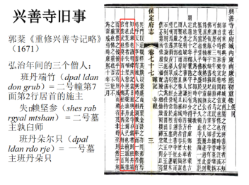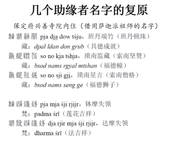 毫无疑问,这个问题的解答相当专业,非一般浅学之士可以企及。通过两座经幢对墓主死亡的西夏文描述的比较,先生推测一号经幢的墓主可能是非正常死亡。其中一些词汇也很特别,如一号经幢西夏文题记中“诸金圣佛寺格坚失里书”的“诸金”,聂老师推测可能等于“世界”,而世界这个词在元代以后的西夏文文献里,指的是元大都,由此判断这句话可能是指在元大都有一个寺叫做圣佛寺,圣佛寺的格坚失里和尚书写了这篇题记。先生还对几个助缘者名字进行了复原,认为他们借用了萨迦派祖师的名字,由此推测兴善寺或许属于藏传佛教萨迦派,是一座党项人信奉的寺庙。这就引出了第二个问题。