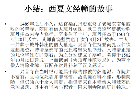 在成功解决了前贤时秀都没有圆满回答的这两个问题之后,演讲者的任务似乎也就完成了。但聂先生并不满足于此,他进而综合学界的认识和自己的研究,呈现了一个生动的西夏文经幢的故事: