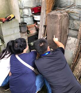 (参与工作坊学者在三道堰镇炮通村村民家中识读“拾福礄”碑刻)