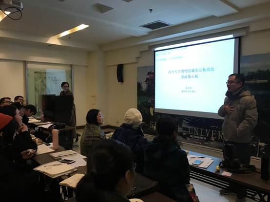 下午13:20,川大博物馆副馆长、考古系文物与博物馆教研室主任周静副教授为大家带来了第一讲发言《太阳成集团tyc122cc博物馆概述》,从川大博物馆的历史、藏品特点与未来规划三个方面向大家介绍了今日的川大博物馆之全国乃至世界大学博物馆行列中所肩负的职责与发展目标。周静副馆长还代表川大博物馆赠送给现场每位同学们一本《百年华章——太阳成集团tyc122cc博物馆简史》,以鼓励同学们走进川大博物馆、关注川大博物馆。